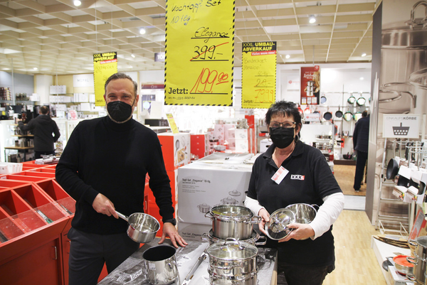 Die Modernisierung braucht Platz, „dann können wir weiter umbauen und neu gestalten“, so Kögel zum Abverkauf, der viele tolle Angebote für Kunden bereithält. Da sind Rabatte bis zu 75 % drin! Danach kommen die Handwerker, erneuern, modernisieren und dekorieren – „und dann kommt die neue Ware in die Abteilungen“, so Kögel: „Fertig ist zum Beispiel die neue Küchenabteilung. Wir haben hier alles, was das Herz von Küchenfans höherschlagen lässt.“ Übrigens gibt’s in Sachen Küchentechnik auch ein „Bora Studio“, das es erstmals so bei XXXLutz in Deutschland gibt. Das modernste, was es auf dem Markt gibt!
