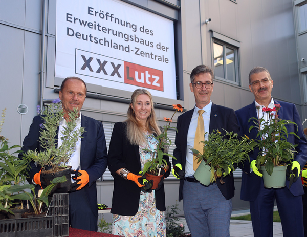 Gemeinsam mit Würzburgs Oberbürgermeister Christian Schuchardt (2.v.l.) und Staatssekretärin Anna Stolz haben Alois Kobler (CEO XXXLutz Deutschland) und Martin Kohlhepp (Gebietsleiter Logistik XXXLutz) Stauden zur Eröffnung des Erweiterungsbaus der XXXLutz Deutschland-Zentrale gepflanzt.